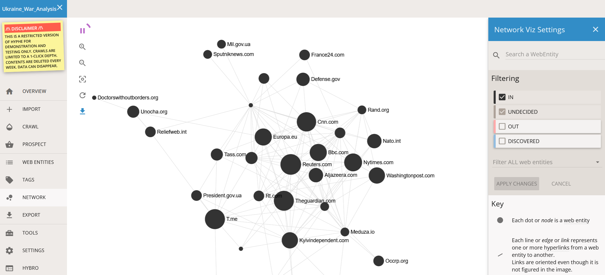 Hyphe permet de constituer un corpus de pages web sur un sujet spécifique et d’identifier les liens entre elles. Il est possible de créer des cartographies interactives de ces réseaux. Les sites web peuvent être regroupés en entités et les acteurs catégorisés. De nouvelles entités sont automatiquement suggérées en explorant les hyperliens de chaque entité présente dans le corpus.