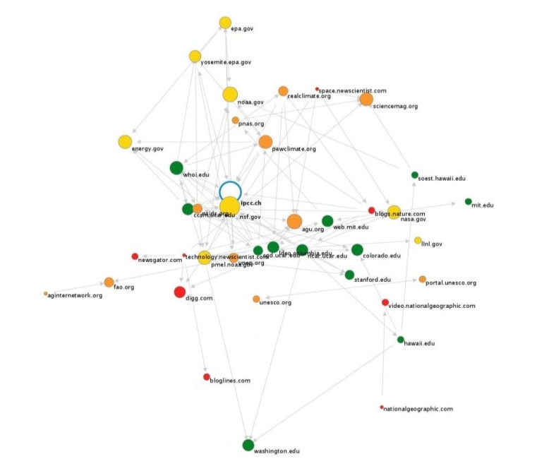 Issue Crawler permet d’identifier un réseau d’acteurs à travers les informations et liens qu’ils partagent. Il sert à dresser des cartographies qui permettent de cerner les caractéristiques des échanges sur un sujet, en différenciant entre type d’acteurs, intensité de l’engagement et type de relation.