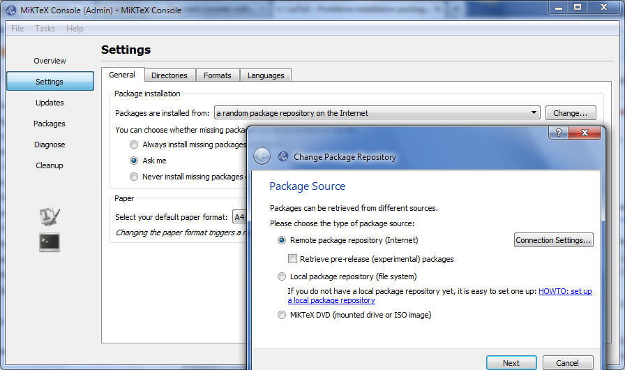 MiKTeX Console, l’interface de gestion, permet de paramétrer le comportement du système face aux paquets manquants. Trois options sont disponibles : demander confirmation avant chaque installation, installer automatiquement sans intervention, ou ignorer les paquets manquants. Le gestionnaire permet également de choisir le dépôt source de téléchargement et de mettre à jour la liste des paquets disponibles.