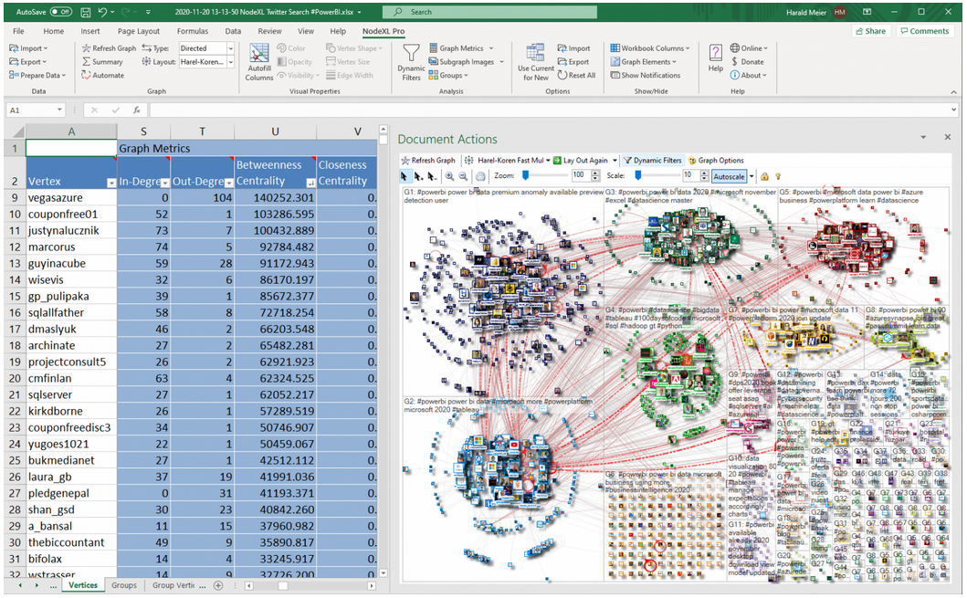 NodeXL permet de collecter, d’analyser et de visualiser les données d’une variété de réseaux sociaux. Destiné à des utilisateurs sans compétences en programmation, NodeXL est un fichier préconfiguré Excel qui peut être ouvert avec l’application Excel de Microsoft.