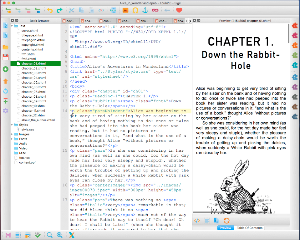 Sigil-Ebook propose ainsi deux modes d’édition : un volet affichant directement le code HTML/CSS du livre et un volet montrant le texte mis en forme. L’utilisateur peut passer de l’un à l’autre à tout moment pour choisir entre une intervention dans le code ou un travail plus proche d’un traitement de texte.