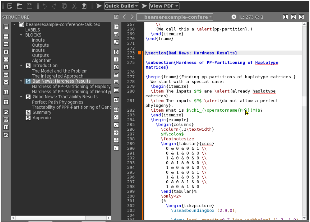 L’éditeur propose une coloration syntaxique qui distingue les commandes, les commentaires et le texte. L’autocomplétion suggère les commandes courantes au fur et à mesure de la frappe. Des menus permettent d’insérer rapidement les balises LaTeX, les symboles mathématiques et les caractères grecs. Le panneau "Structure" affiche l’organisation du document et permet de naviguer entre les sections par simple clic.