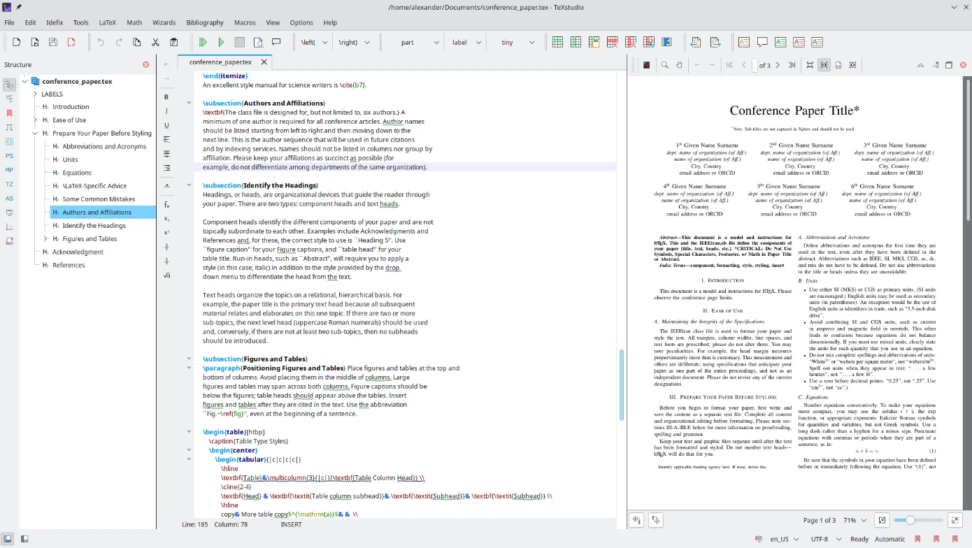 Le texte est ensuite saisi en LaTeX en ajoutant des sections, des environnements et des éléments tels que formules, figures ou tableaux. L’éditeur met en évidence la structure du document dans un panneau latéral, ce qui facilite la navigation et la correction.