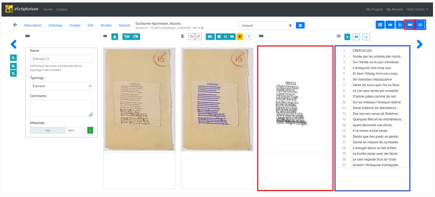eScriptorium offre une interface qui permet de voir simultanément l’image originale et le texte transcrit, facilitant les ajustements et les corrections.