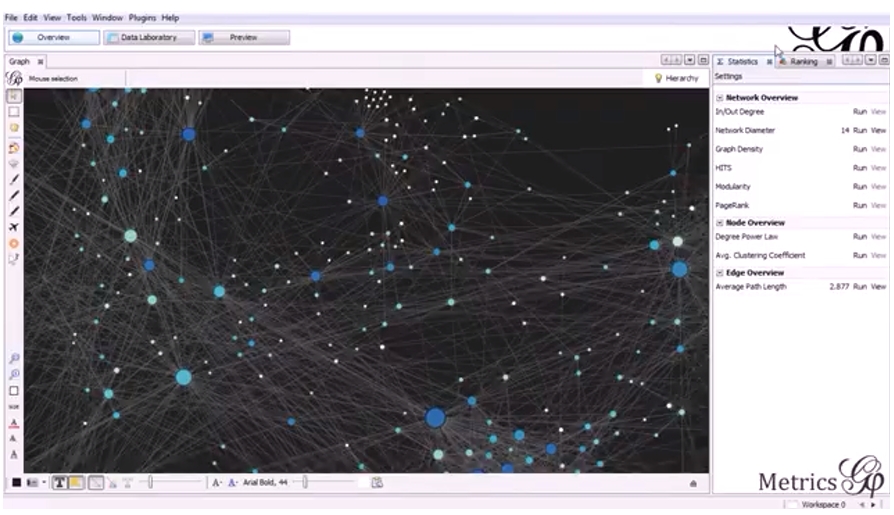 Gephi est un outil d’analyse et de représentation de réseaux simple, puissant et flexible. Il permet de créer et d’étudier des données statistiques à l’aide de graphiques. L’utilisateur peut interagir avec la représentation et manipuler ses structures, formes et couleurs.