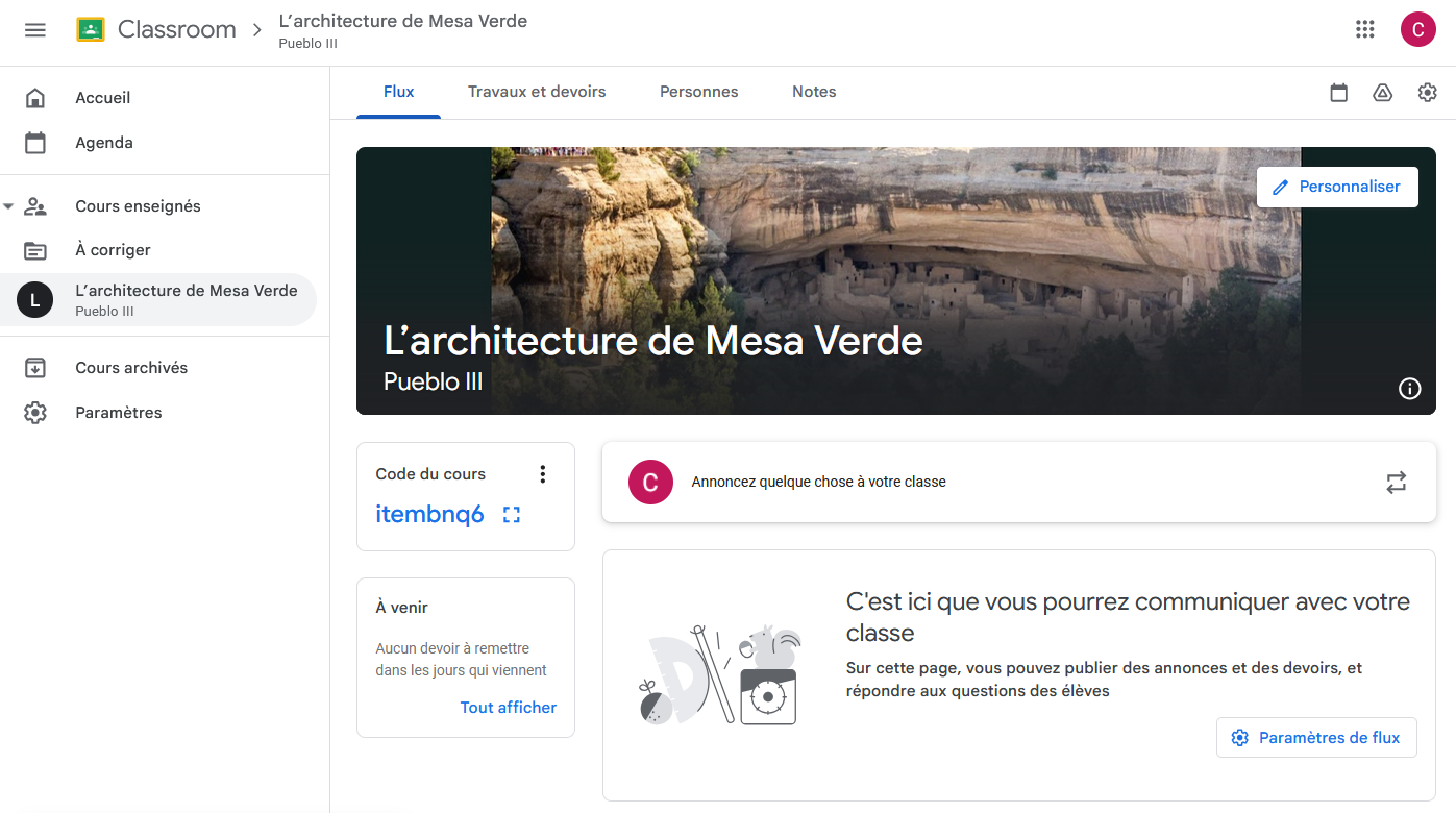 L’enseignant peut créer un cours en ligne en quelques étapes. Une fois le cours créé, il est possible d’y inviter des élèves, de publier des contenus, d’organiser les ressources par thèmes et de structurer un fil d’actualités. L’organisation repose sur une approche chronologique ou thématique, selon les préférences de l’enseignant.