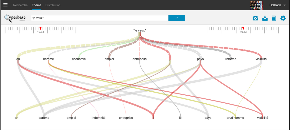 Hyperbase est une application dédiée à la textométrie, permettant l’analyse de corpus et la visualisation des données. Elle donne accès à des corpus déjà constitués, permet le travail avec de nouveaux corpus et combine des outils d’exploration avec une interface ergonomique. Des algorithmes de deep learning sont disponibles dans l’application web. Ils étendent les possibilités d’explorations des textes, dont le repérage automatique de motifs linguistiques profonds.